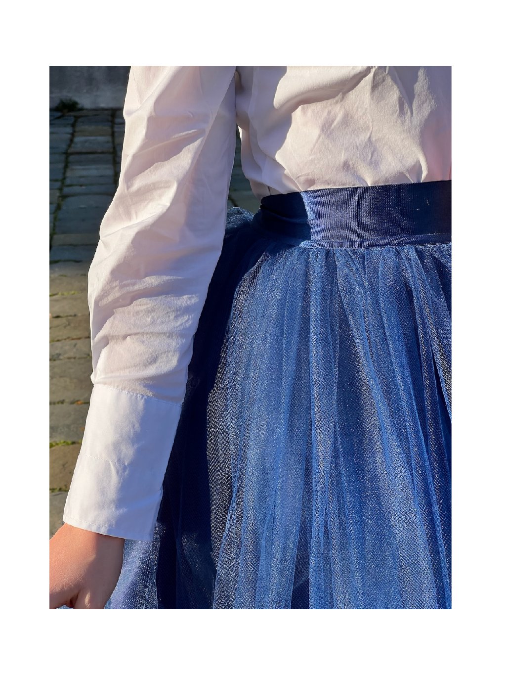 Pas je pevný, ale pohodlný, sukně se v horní části nerozšiřuje a objem vzniká postupně díky vrstvení jemného tylu.